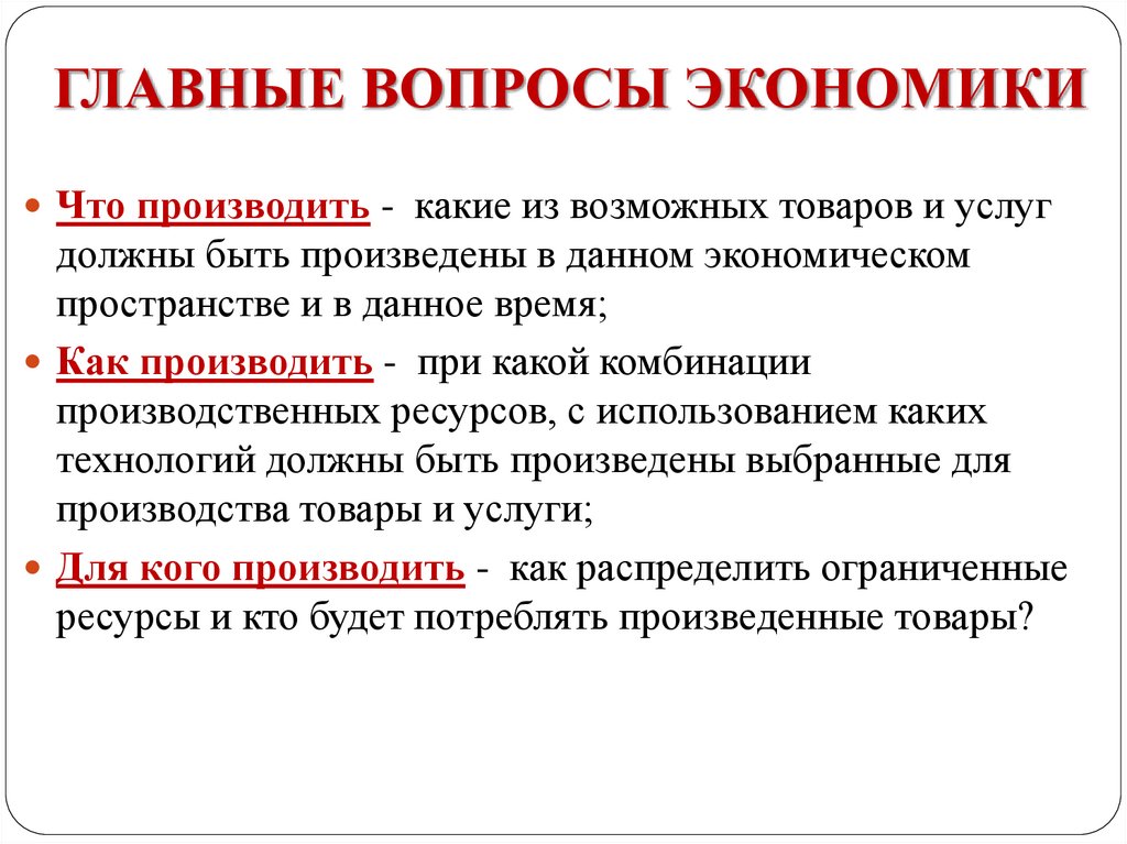 ГЛАВНЫЕ ВОПРОСЫ ЭКОНОМИКИЧто производить - какие из возможных товаров и услуг