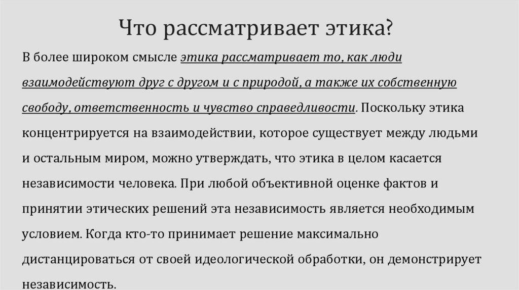 Что рассматривает этика?В более широком смысле этика рассматривает то, как люди