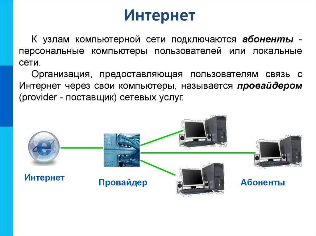ИнтернетК узлам компьютерной сети подключаются абоненты персональные компьютеры пользователей или локальные