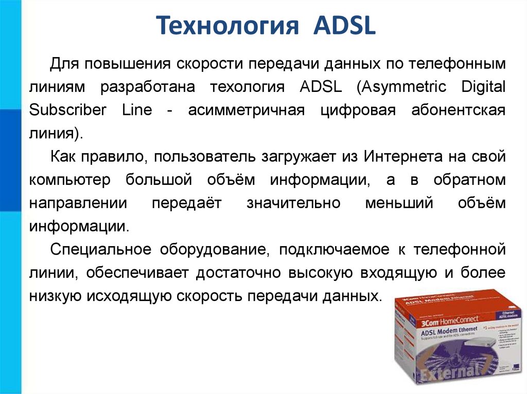 Технология ADSLДля повышения скорости передачи данных по телефонным