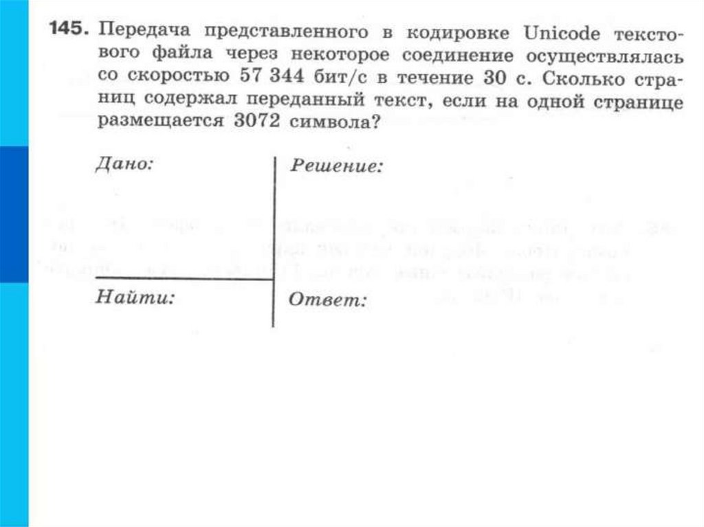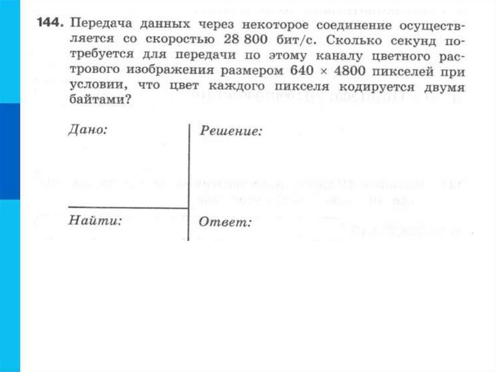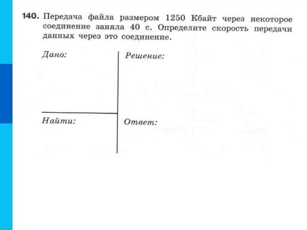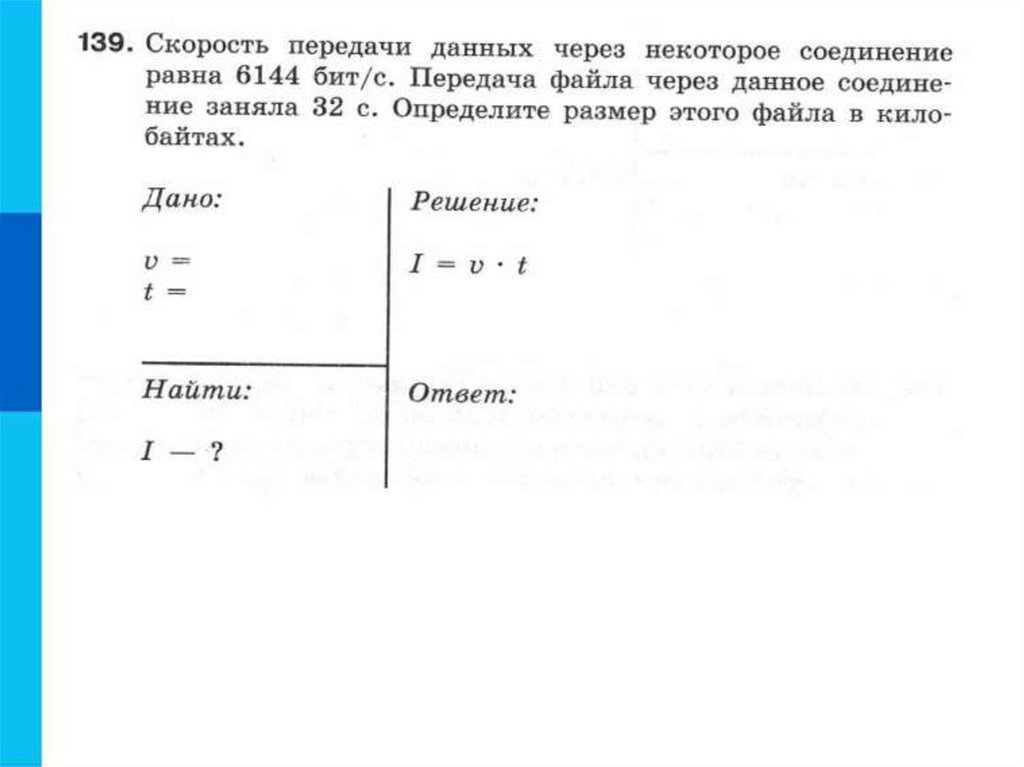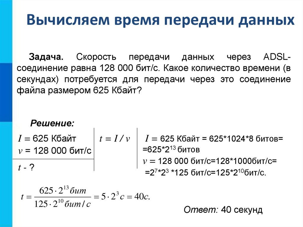 Вычисляем время передачи данныхЗадача. Скорость передачи данных через ADSLсоединение равна 128 000 бит/c. Какое количество времени (в