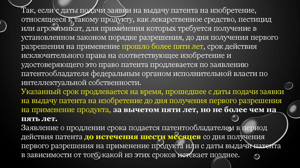 Так, если с даты подачи заявки на выдачу патента на изобретение,относящееся к такому продукту, как лекарственное средство, пестицид