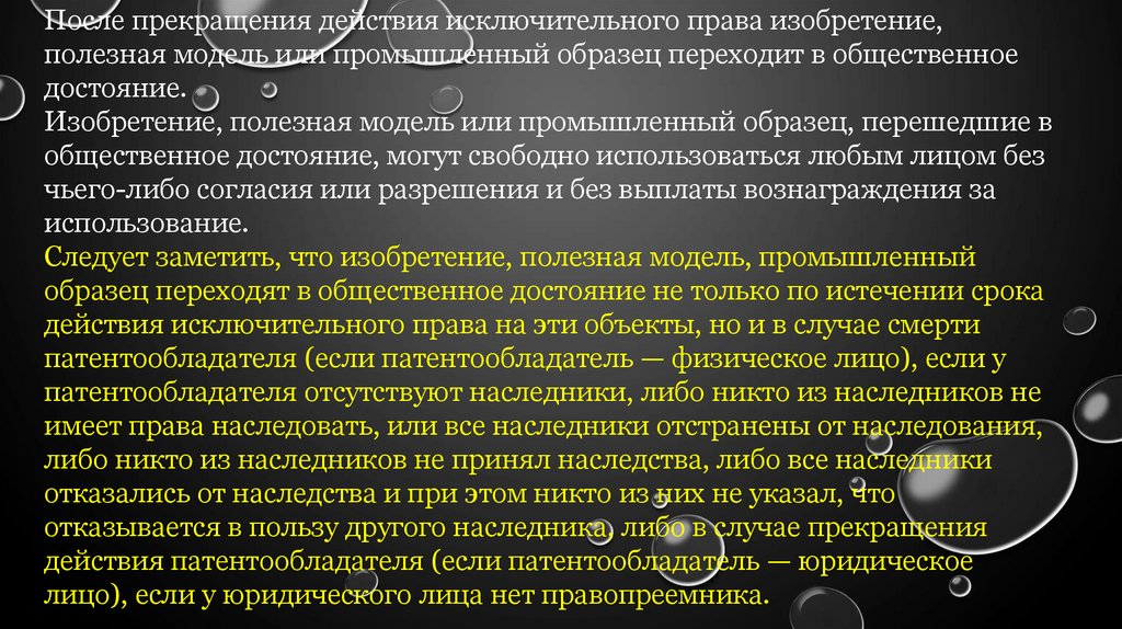 После прекращения действия исключительного права изобретение,полезная модель или промышленный образец переходит в общественное