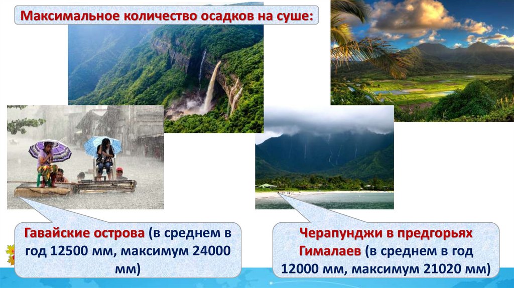 Максимальное количество осадков на суше:Гавайские острова (в среднем в