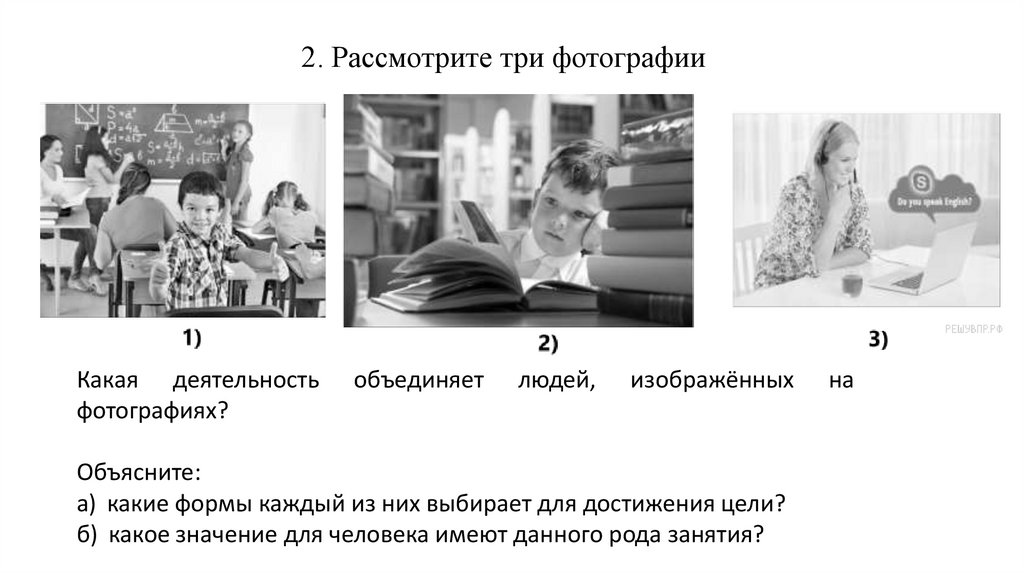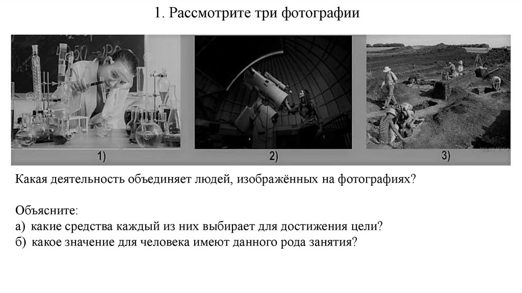 1. Рассмотрите три фотографииКакая деятельность объединяет людей, изображённых на фотографиях?
