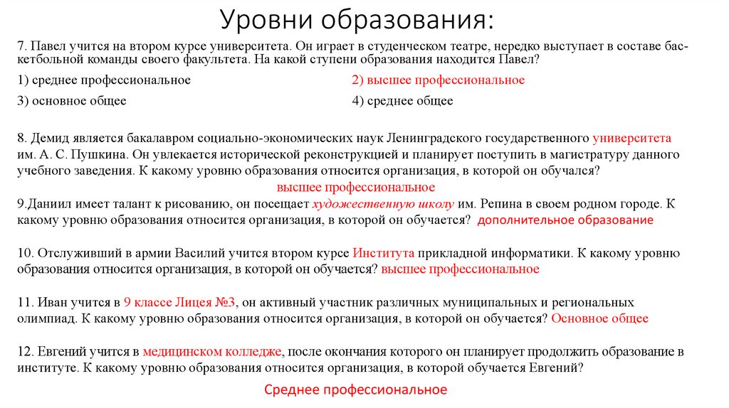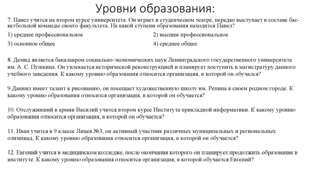 Уровни образования:7. Павел учится на втором курсе университета. Он играет в студенческом театре, нередко выступает в составе баскетбольной команды своего факультета. На какой ступени образования находится Павел?