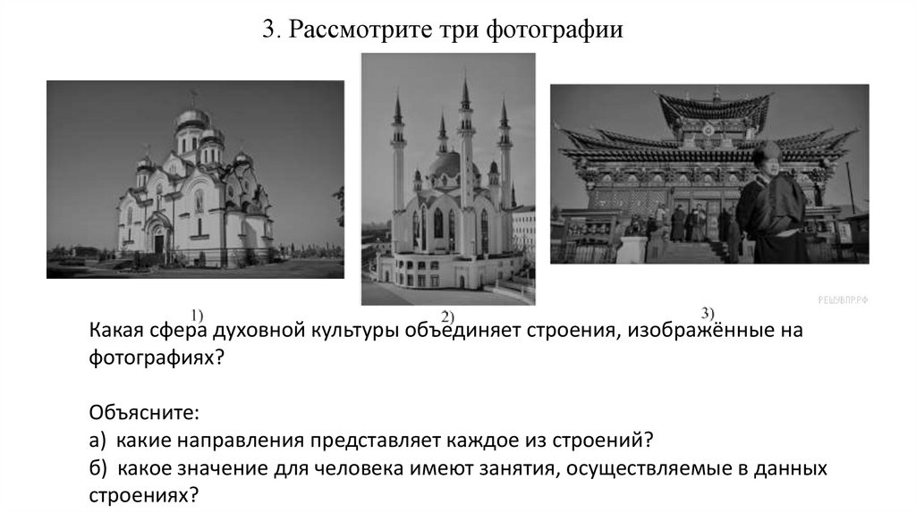 3. Рассмотрите три фотографииКакая сфера духовной культуры объединяет строения, изображённые на
