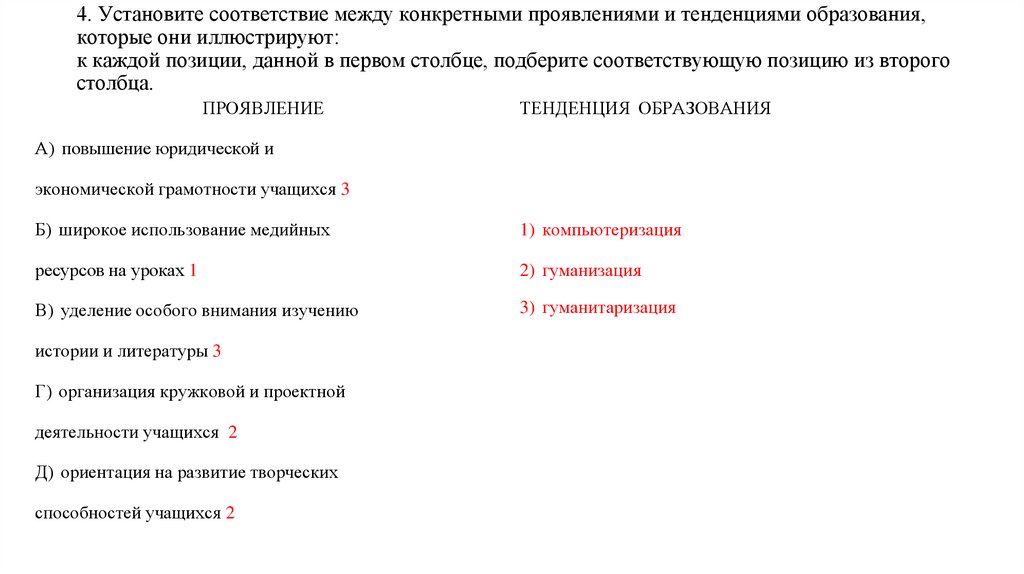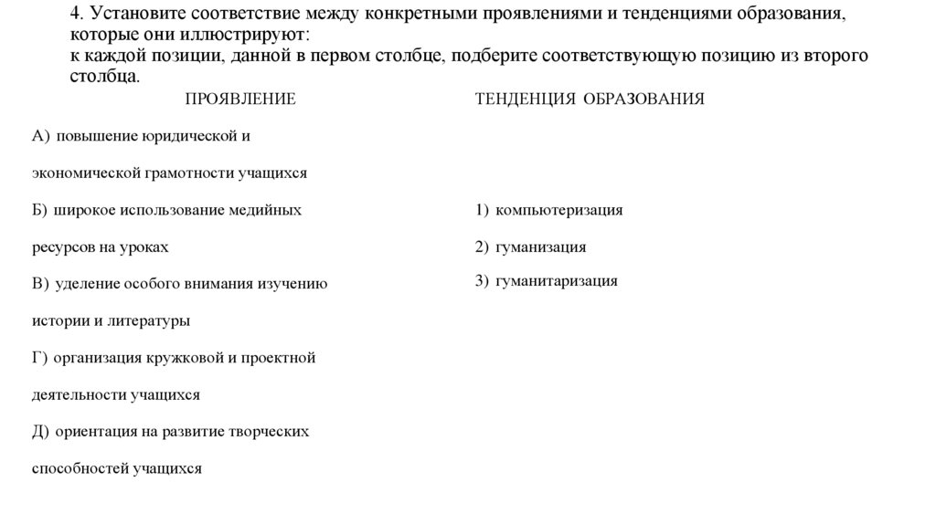 4. Установите соответствие между конкретными проявлениями и тенденциями образования,которые они иллюстрируют: