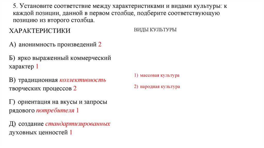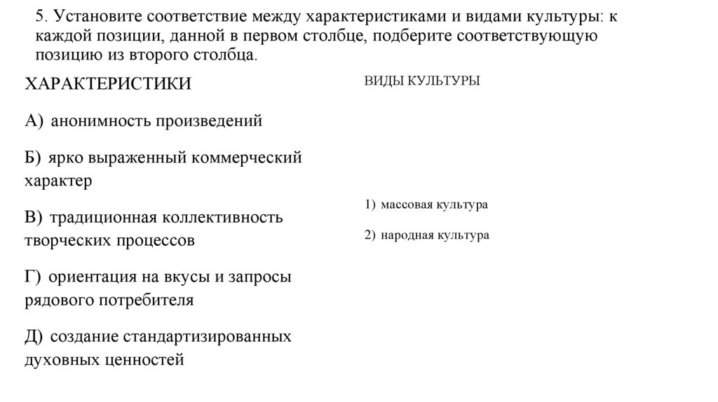 5. Установите соответствие между характеристиками и видами культуры: ккаждой позиции, данной в первом столбце, подберите соответствующую