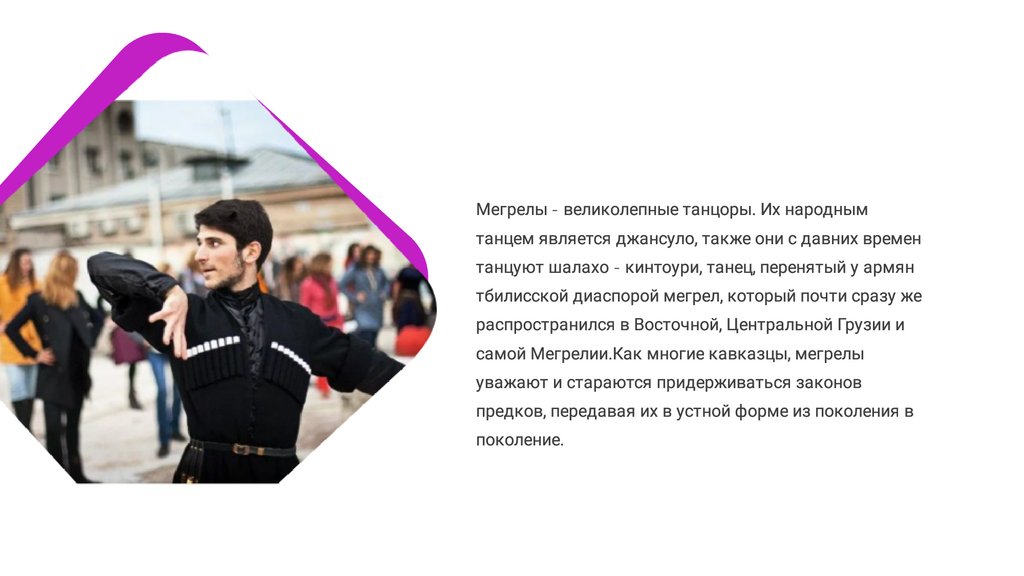 Мегрелы - великолепные танцоры. Их народнымтанцем является джансуло, также они с давних времен