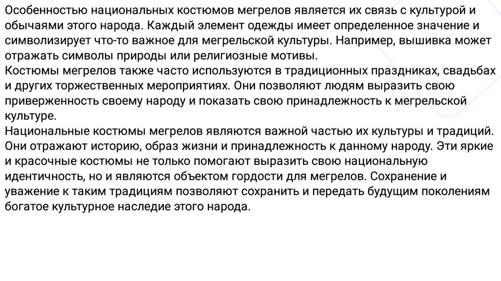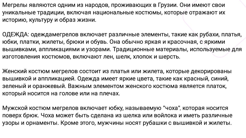 Особенностью национальных костюмов мегрелов является их связь с культурой иобычаями этого народа. Каждый элемент одежды имеет определенное значение и