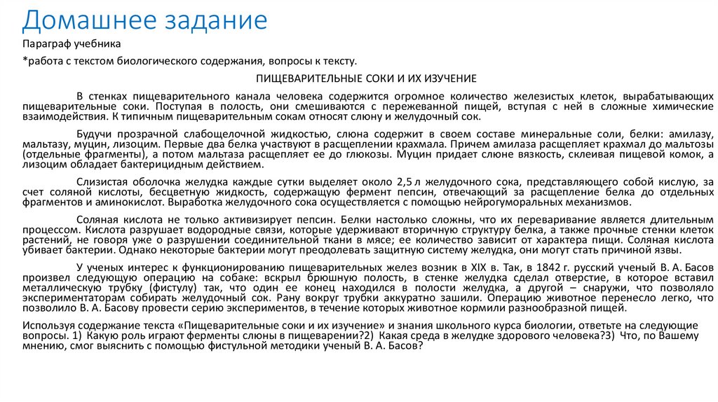 Используя содержание текста «Пищеварительные соки и их изучение» и знания школьного курса биологии, ответьте на следующие