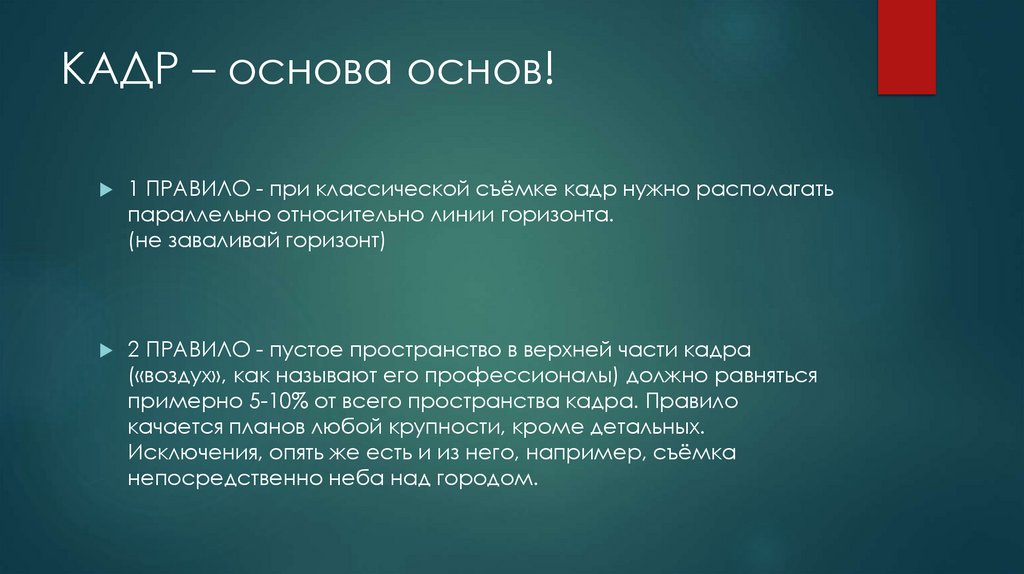 КАДР – основа основ!1 ПРАВИЛО - при классической съёмке кадр нужно располагать