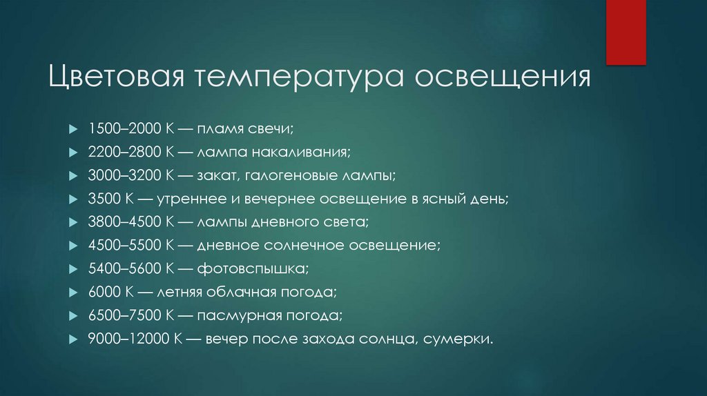 Цветовая температура освещения1500–2000 К — пламя свечи;