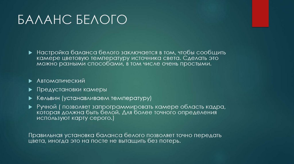 БАЛАНС БЕЛОГОНастройка баланса белого заключается в том, чтобы сообщить