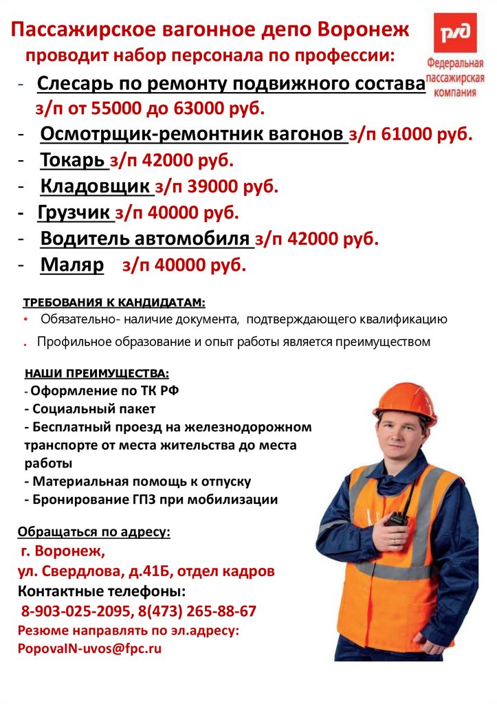 Пассажирское вагонное депо Воронежпроводит набор персонала по профессии:
