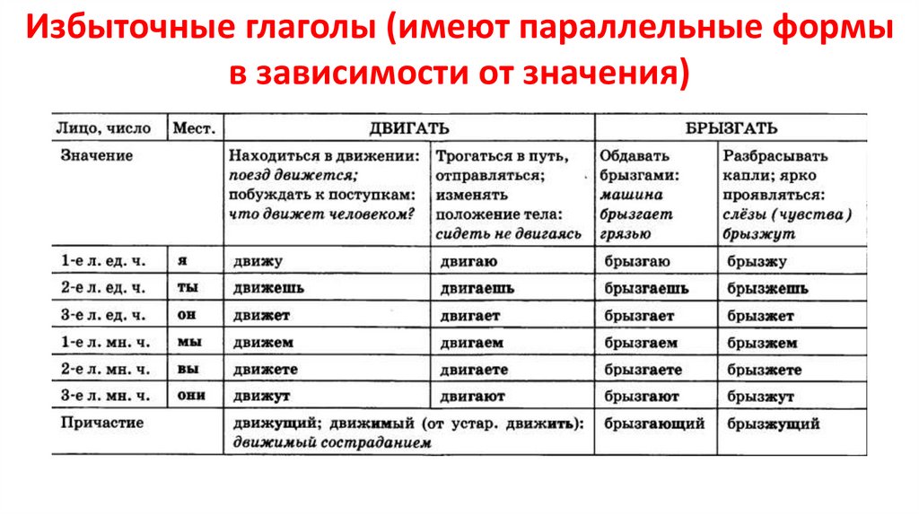 Избыточные глаголы (имеют параллельные формыв зависимости от значения)
