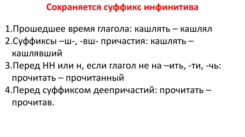 Сохраняется суффикс инфинитива1.Прошедшее время глагола: кашлять – кашлял