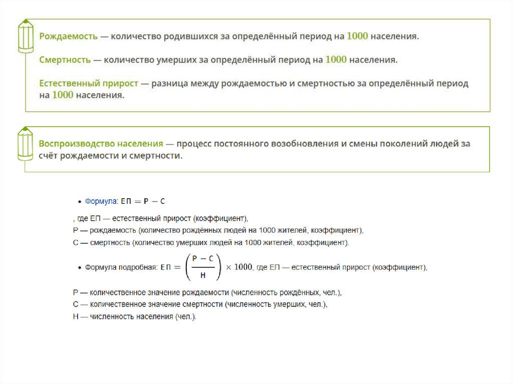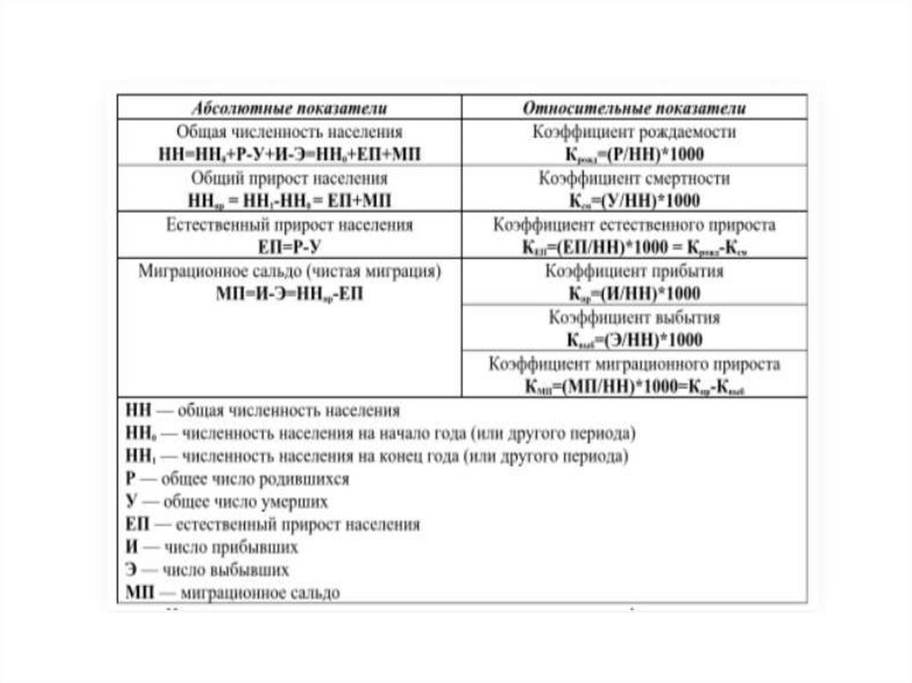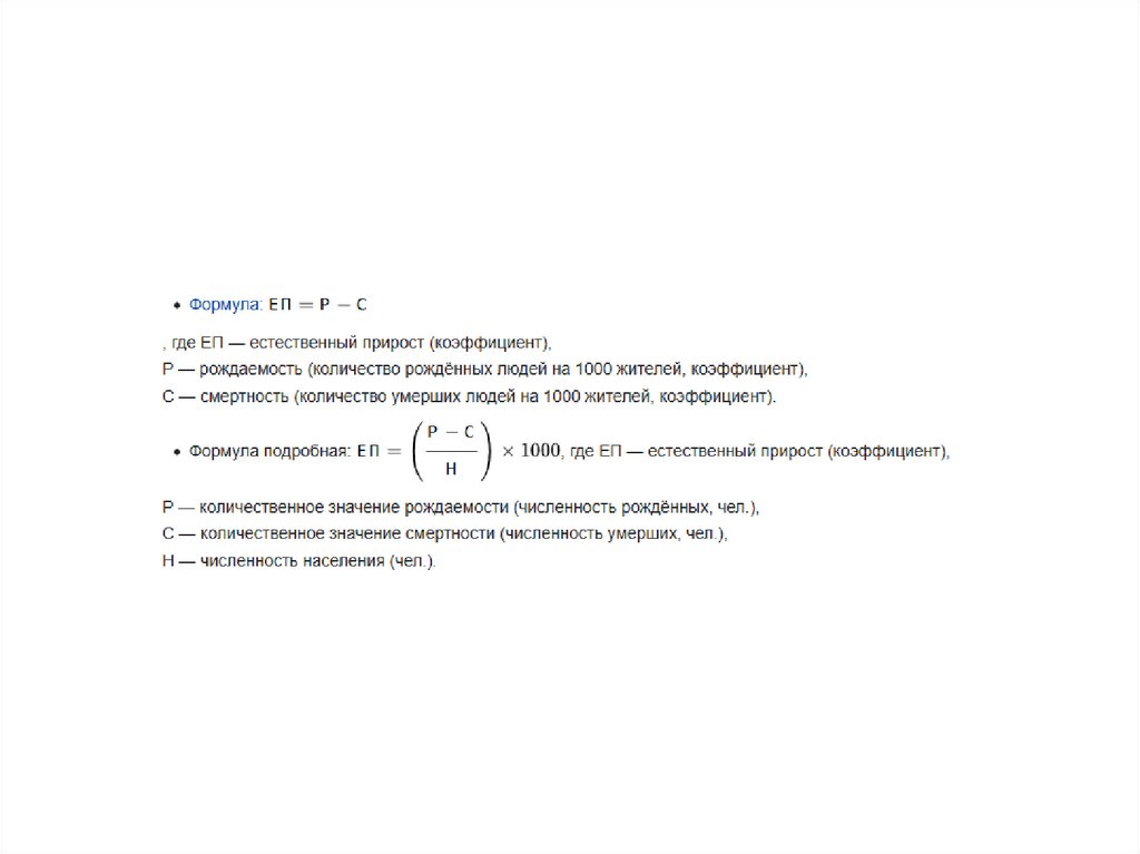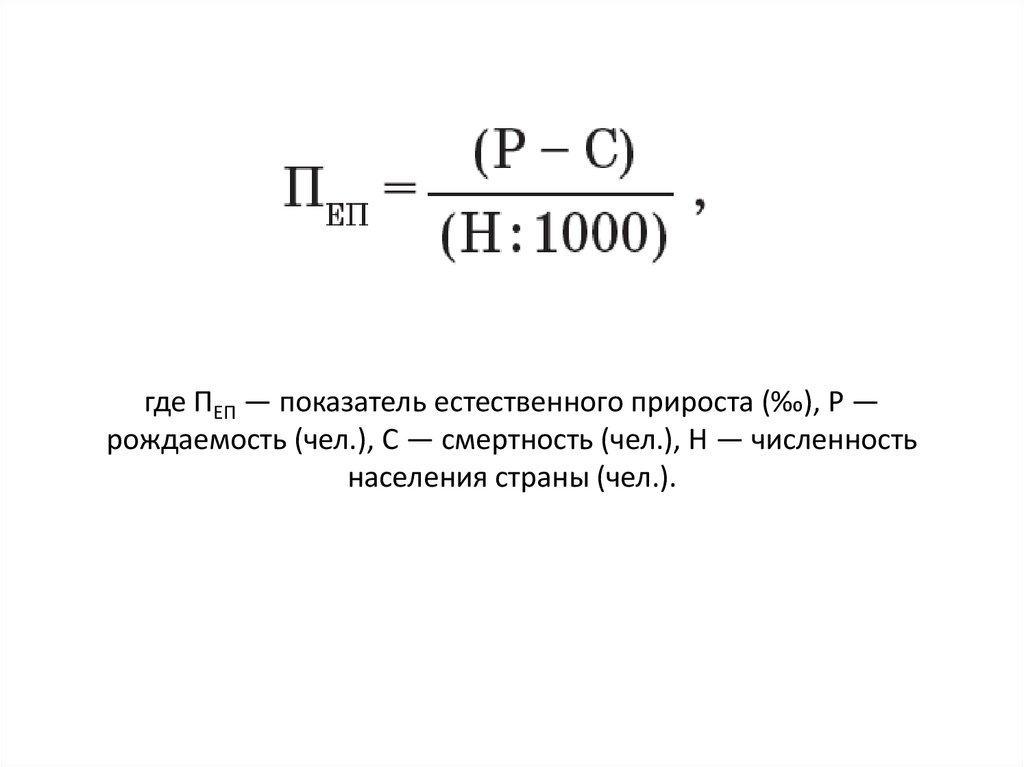 где ПЕП — показатель естественного прироста (‰), Р —рождаемость (чел.), С — смертность (чел.), Н — численность