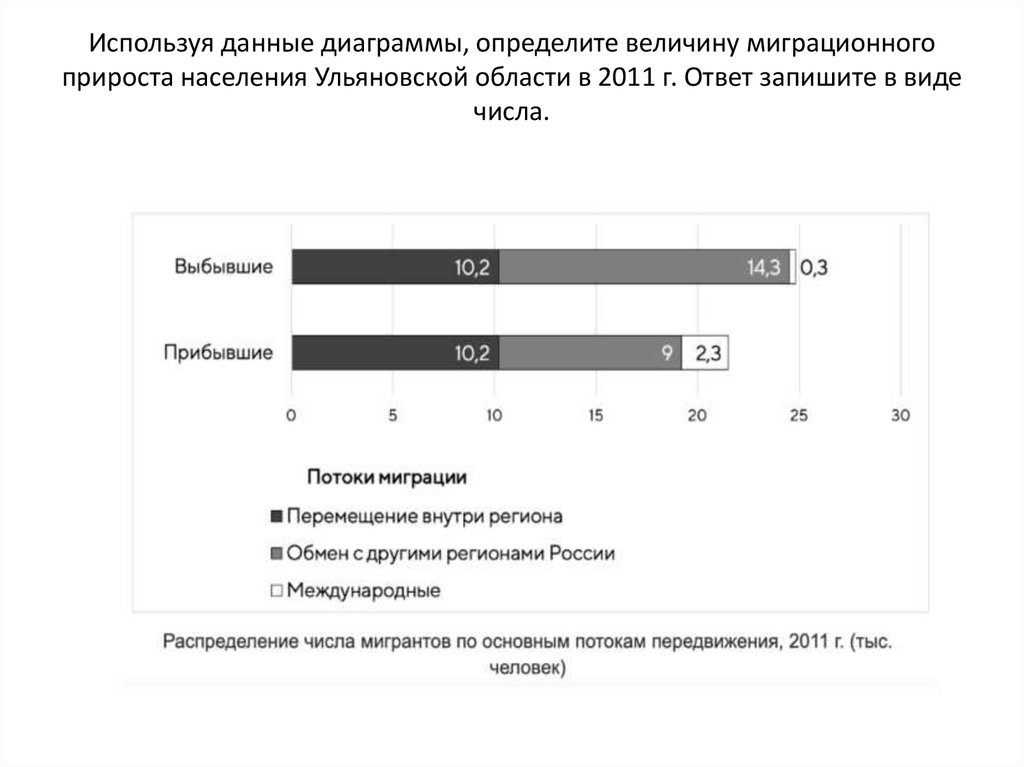Используя данные диаграммы, определите величину миграционногоприроста населения Ульяновской области в 2011 г. Ответ запишите в виде