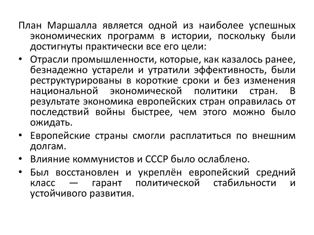 План Маршалла является одной из наиболее успешныхэкономических программ в истории, поскольку были