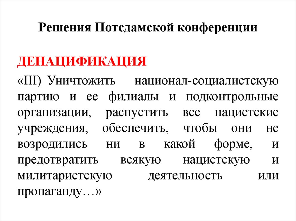 ДЕНАЦИФИКАЦИЯ«III) Уничтожить национал-социалистскую