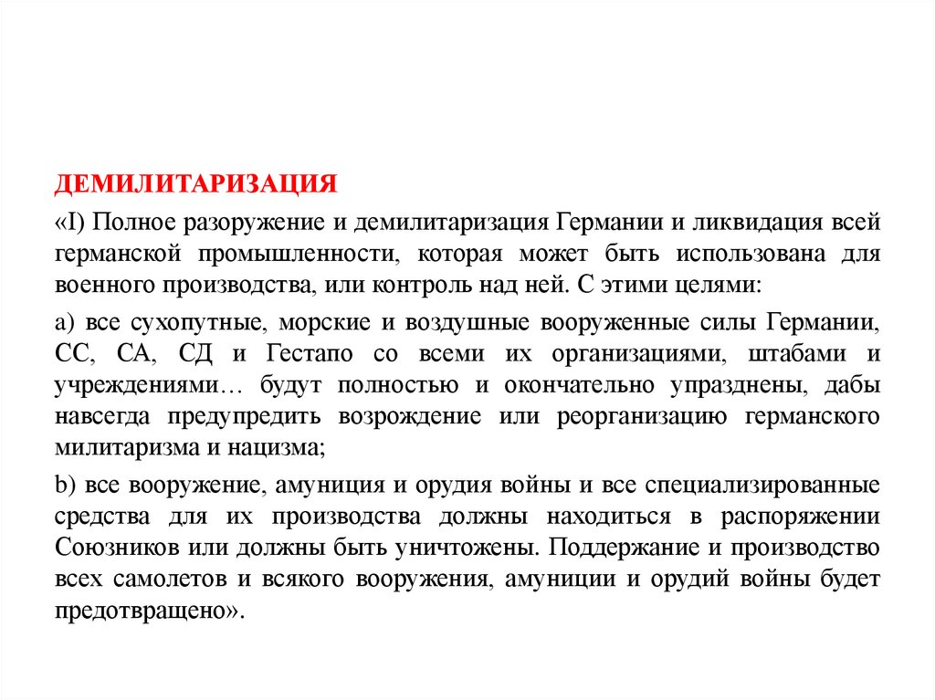 ДЕМИЛИТАРИЗАЦИЯ«I) Полное разоружение и демилитаризация Германии и ликвидация всей