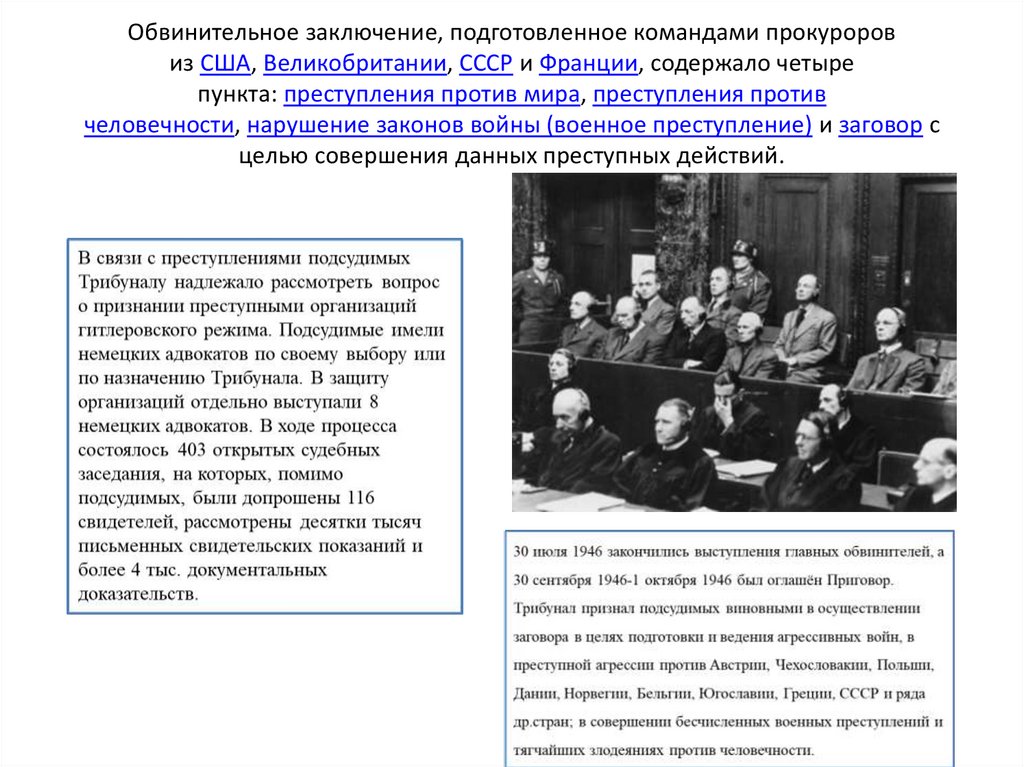 Обвинительное заключение, подготовленное командами прокуроровиз США, Великобритании, СССР и Франции, содержало четыре