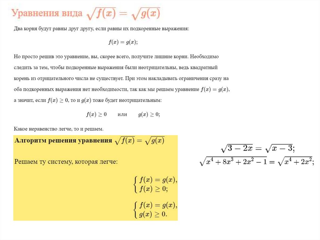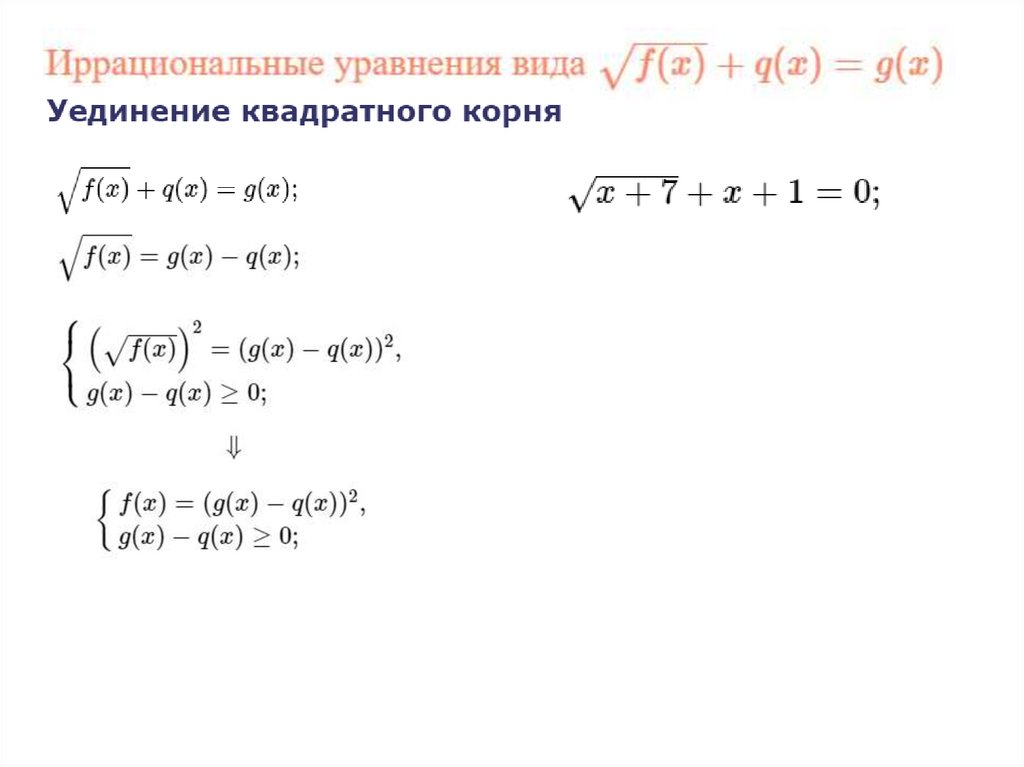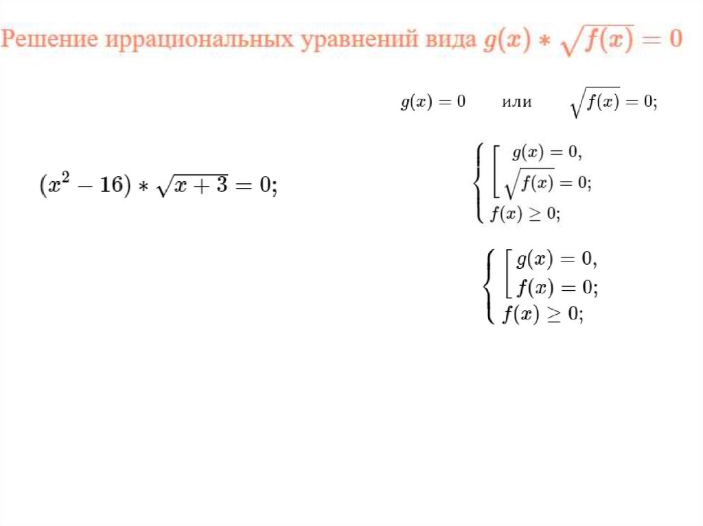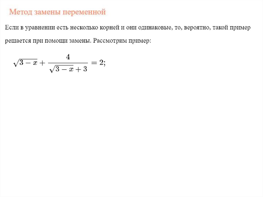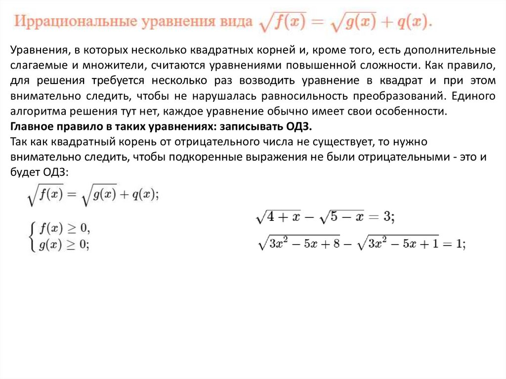 Уравнения, в которых несколько квадратных корней и, кроме того, есть дополнительныеслагаемые и множители, считаются уравнениями повышенной сложности. Как правило,