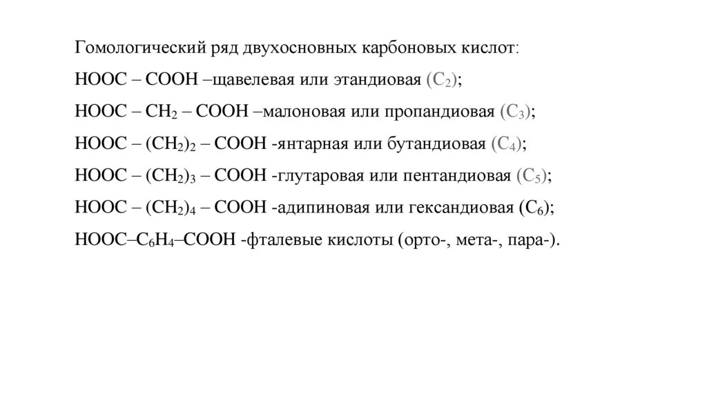 Гомологический ряд двухосновных карбоновых кислот:HOOC – COOH –щавелевая или этандиовая (С2);