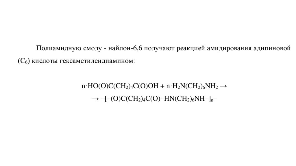 Полиамидную смолу - найлон-6,6 получают реакцией амидирования адипиновой(С6) кислоты гексаметилендиамином: