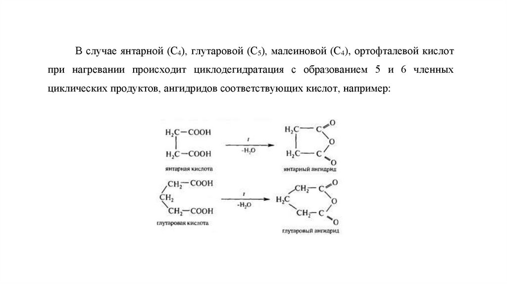 В случае янтарной (С4), глутаровой (С5), малеиновой (С4), ортофталевой кислотпри нагревании происходит циклодегидратация с образованием 5 и 6 членных