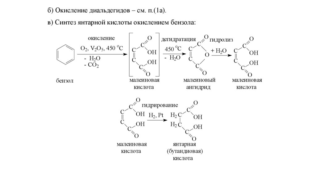 б) Окисление диальдегидов – см. п.(1а).в) Синтез янтарной кислоты окислением бензола: