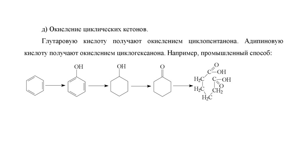 д) Окисление циклических кетонов.Глутаровую кислоту получают окислением циклопентанона. Адипиновую