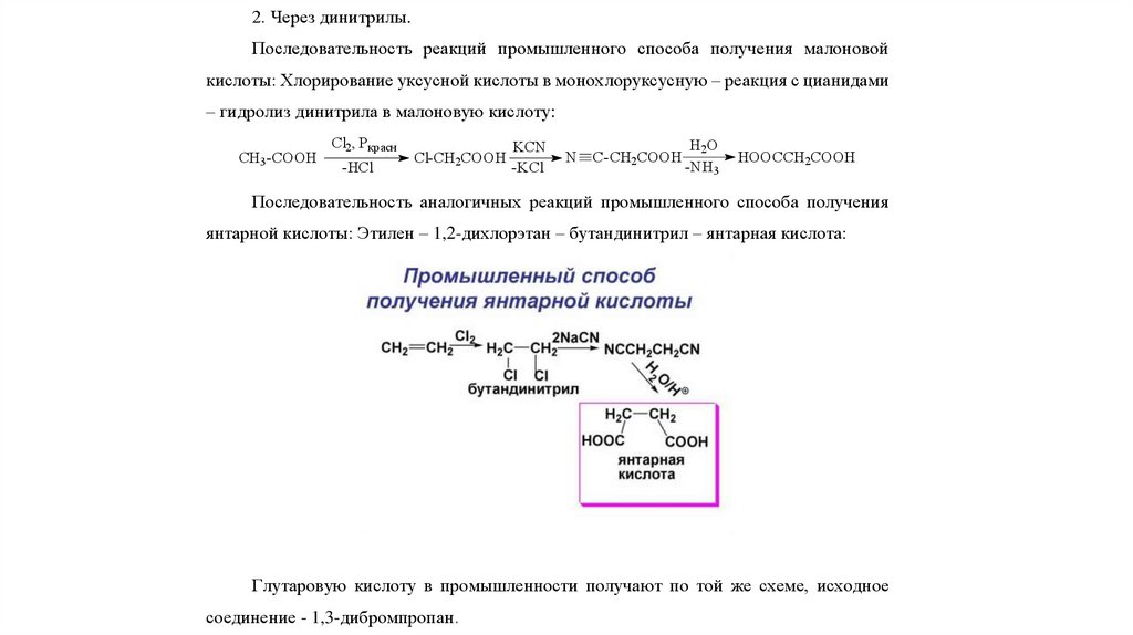 кислоты: Хлорирование уксусной кислоты в монохлоруксусную – реакция с цианидами