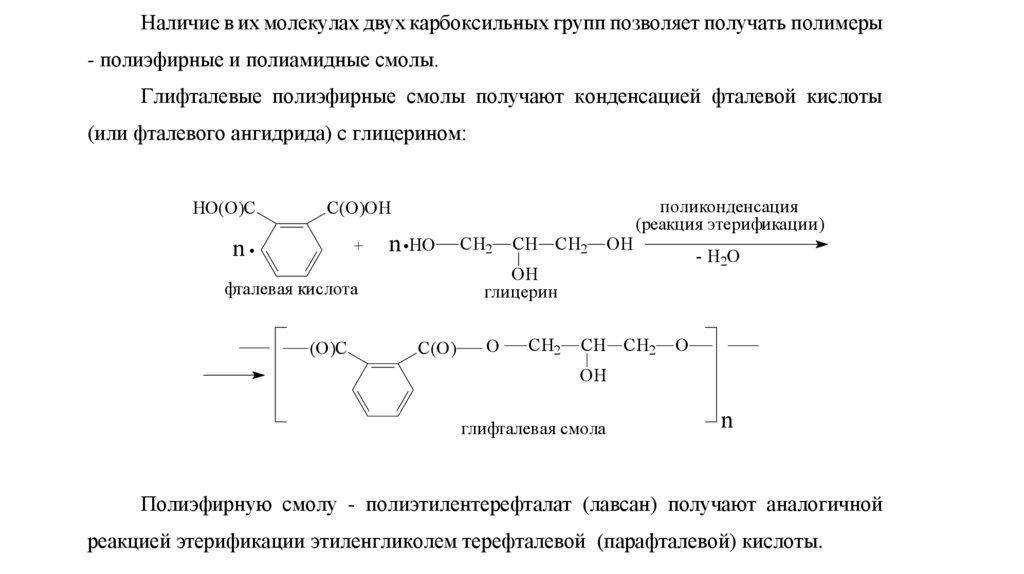 Наличие в их молекулах двух карбоксильных групп позволяет получать полимеры- полиэфирные и полиамидные смолы.