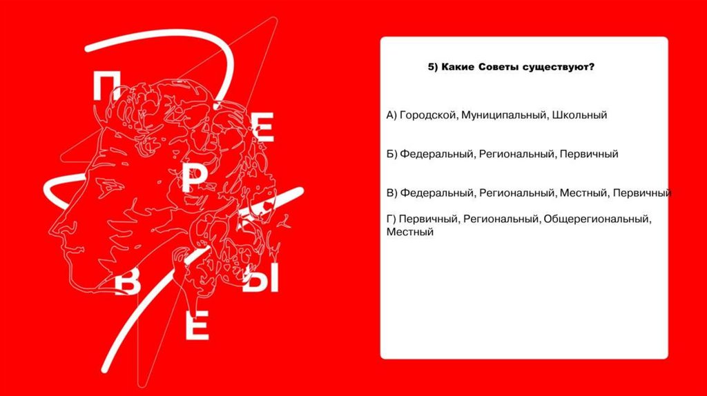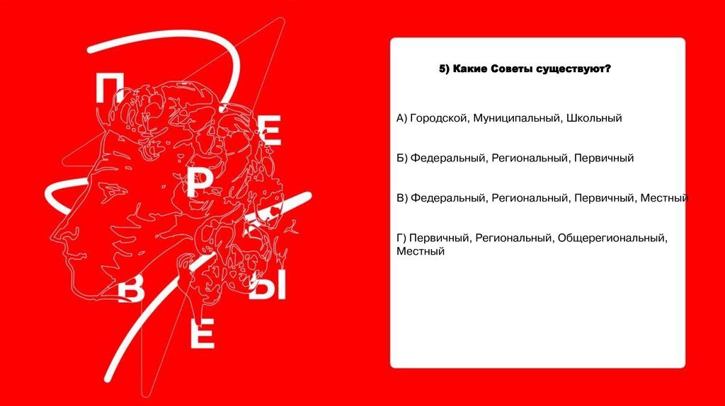 5) Какие Советы существуют?А) Городской, Муниципальный, Школьный