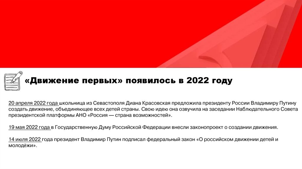 «Движение первых» появилось в 2022 году20 апреля 2022 года школьница из Севастополя Диана Красовская предложила президенту России Владимиру Путину