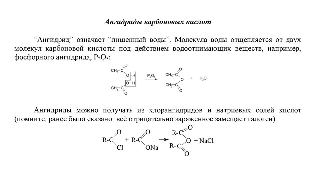 Ангидриды карбоновых кислот“Ангидрид” означает “лишенный воды”. Молекула воды отщепляется от двух