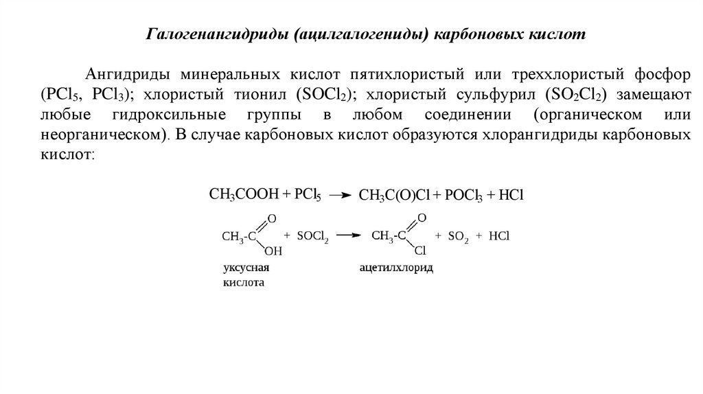 Галогенангидриды (ацилгалогениды) карбоновых кислотАнгидриды минеральных кислот пятихлористый или треххлористый фосфор