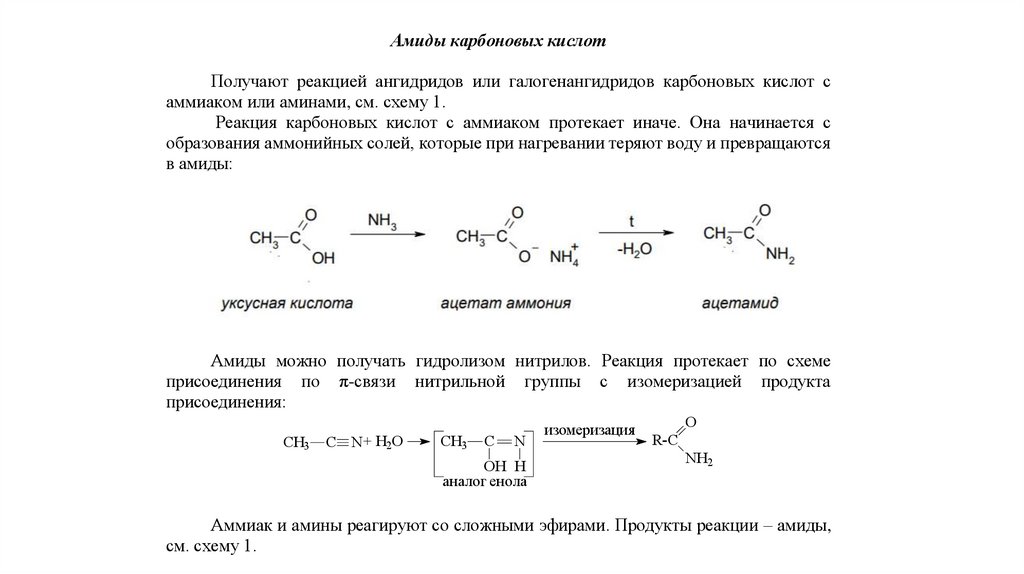 Реакция карбоновых кислот с аммиаком протекает иначе. Она начинается с