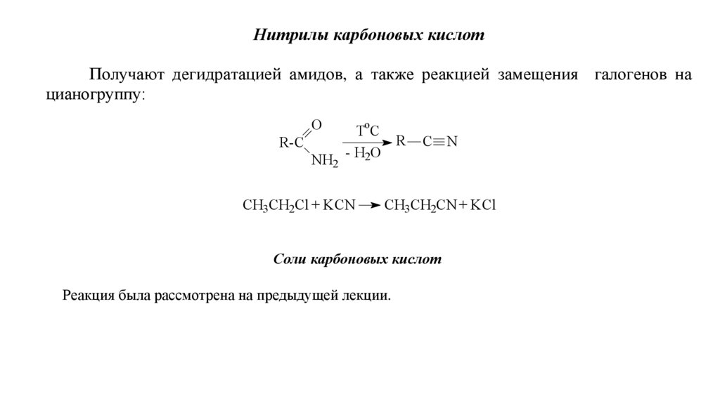 Нитрилы карбоновых кислотПолучают дегидратацией амидов, а также реакцией замещения галогенов на