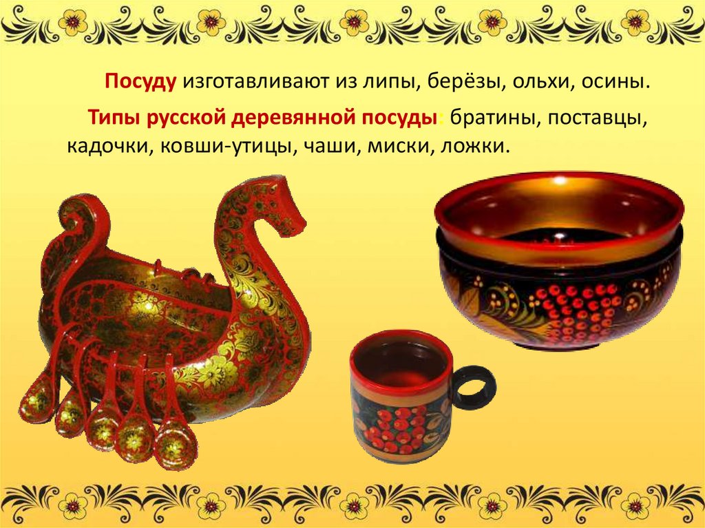 Посуду изготавливают из липы, берёзы, ольхи, осины.Типы русской деревянной посуды: братины, поставцы,