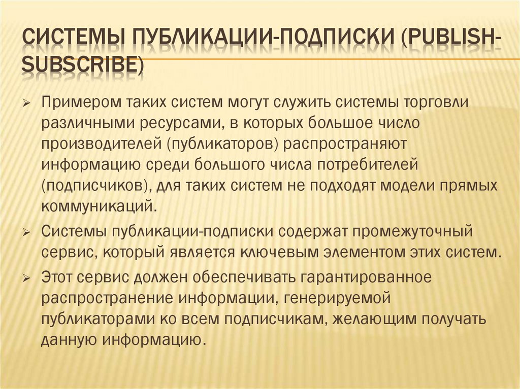 СИСТЕМЫ ПУБЛИКАЦИИ-ПОДПИСКИ (PUBLISHSUBSCRIBE)Примером таких систем могут служить системы торговли