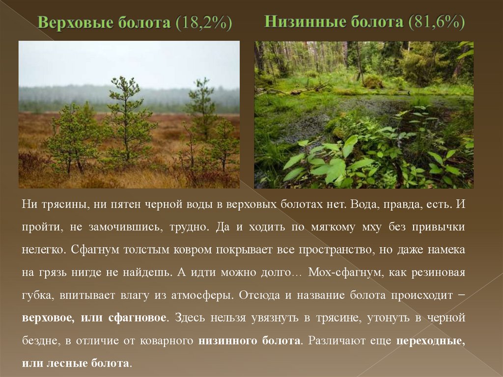 верховое, или сфагновое. Здесь нельзя увязнуть в трясине, утонуть в черной