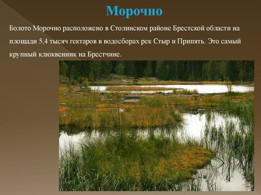 Болото Морочно расположено в Столинском районе Брестской области наплощади 5,4 тысяч гектаров в водосборах рек Стыр и Припять. Это самый