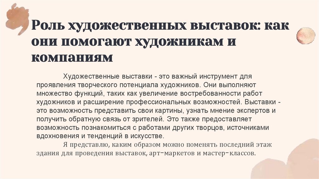 художников и расширение профессиональных возможностей. Выставки это возможность представить свои картины, узнать мнение экспертов и