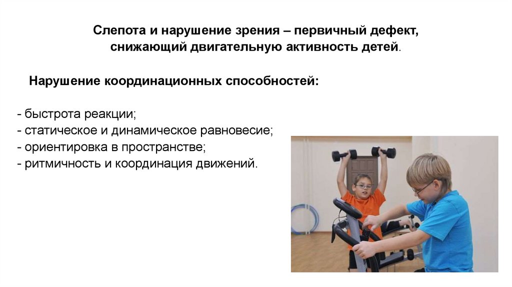 Слепота и нарушение зрения – первичный дефект,снижающий двигательную активность детей.