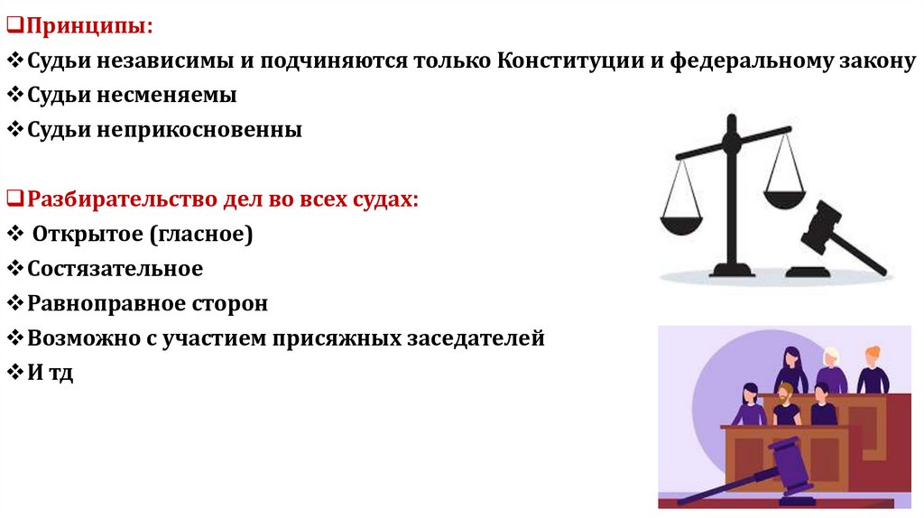 Принципы:Судьи независимы и подчиняются только Конституции и федеральному закону