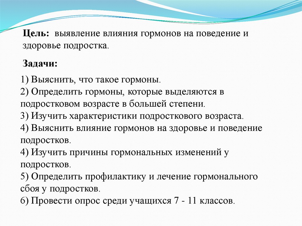 Цель: выявление влияния гормонов на поведение издоровье подростка.
